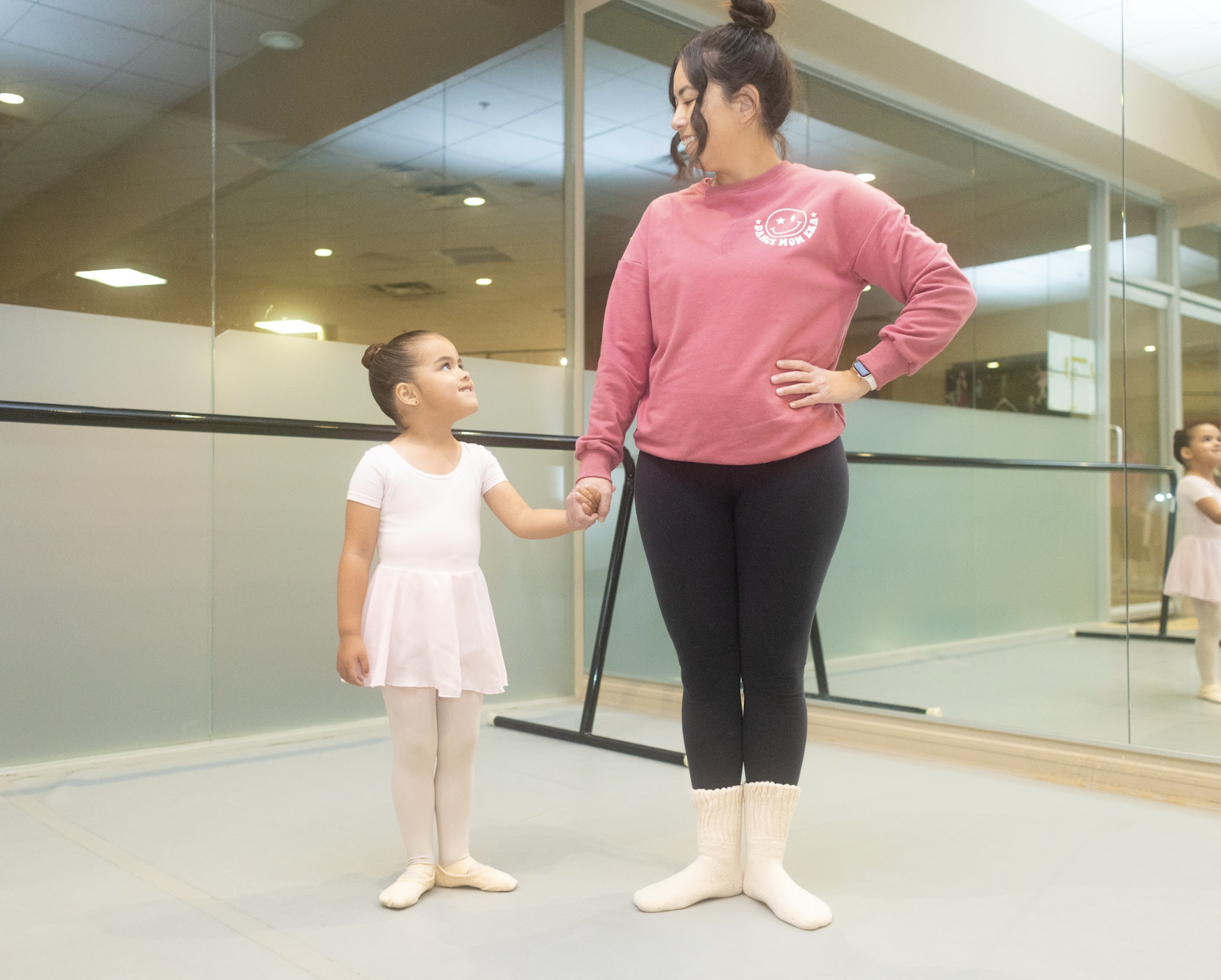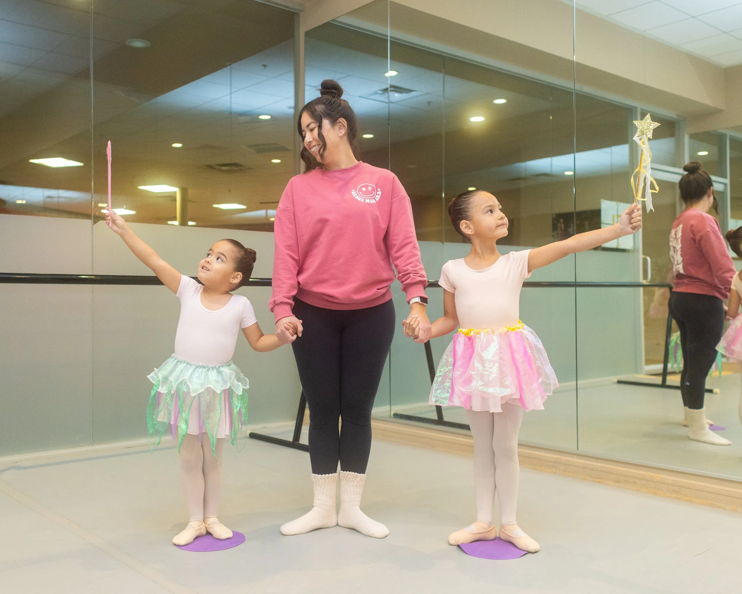 Our Mommy & Me Ballet Workshop is a parent‑and‑child ballet class for children ages 2–3, designed to introduce movement, music, and ballet‑inspired activities in a warm, supportive environment. Parents or caregivers actively participate alongside their child, helping them feel comfortable and confident as they explore movement together.